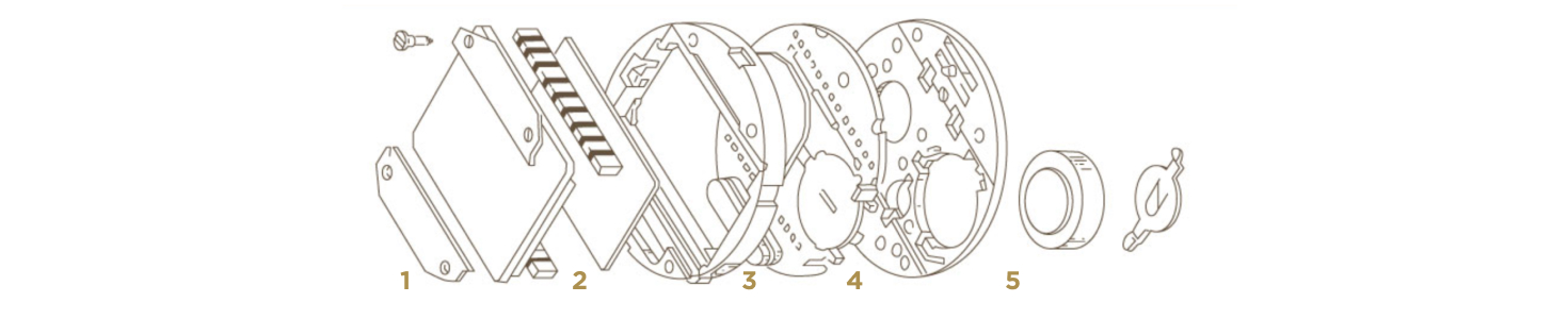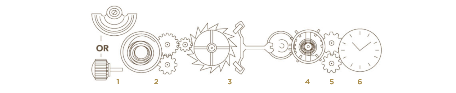 Еще одна серия шестерен, которые передают регулируемую, одинаково дозированную энергию от балансира к стрелкам часов, заставляя их двигаться.