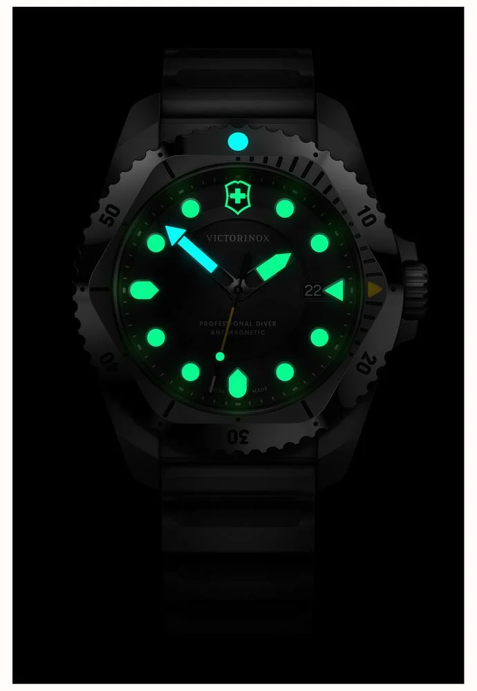 Мужские швейцарские наручные часы Victorinox Swiss Army 241990, хронограф, швейцарский кварцевый механизм Ronda 5030.D, индикация даты. Циферблат черного цвета. Стальной корпус, диаметр 43 мм, вращающийся безель с покрытием из сапфирового стекла, устойчивым к воздействию UV-лучей, накладные цифры, накладные индексы, люминесцентное покрытие на стрелках, сапфировое стекло с тройным антибликовым покрытием, водоустойчивость 300 м.