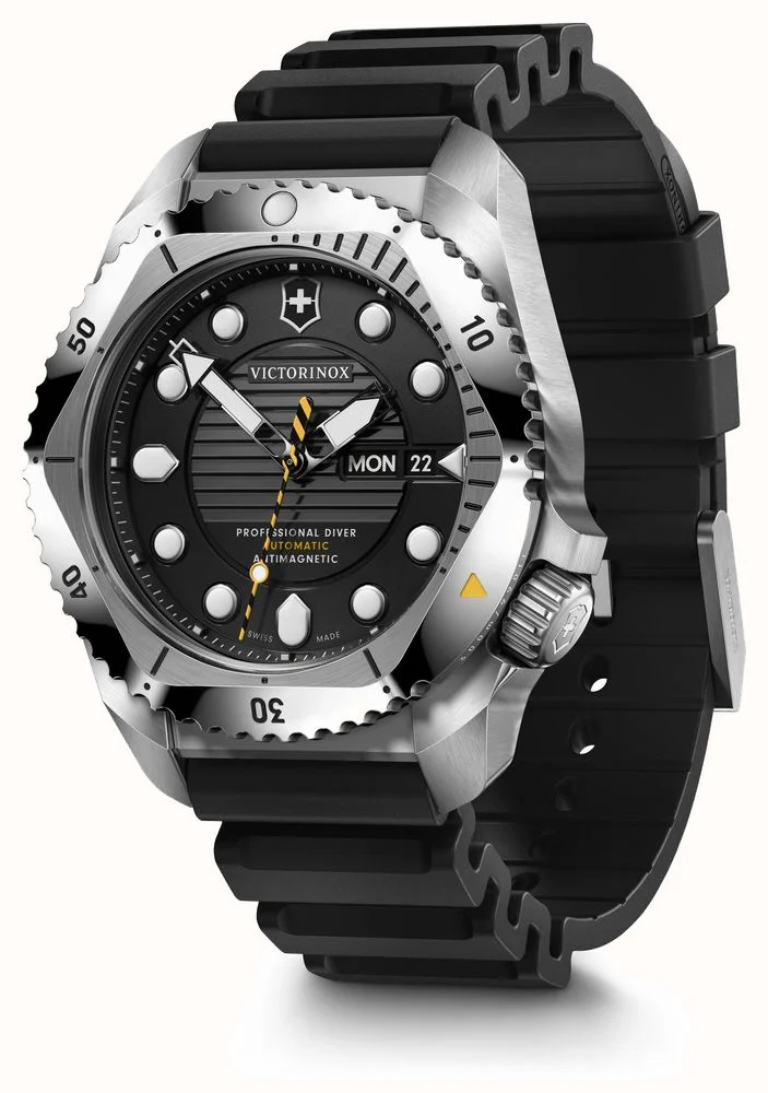 Мужские швейцарские наручные часы Victorinox Swiss Army 241994, швейцарский механический механизм, индикация даты. Циферблат черного цвета. Стальной корпус, диаметр 43 мм, вращающийся безель с покрытием из сапфирового стекла, устойчивым к воздействию UV-лучей, накладные цифры, накладные индексы, люминесцентное покрытие на стрелках, сапфировое стекло с тройным антибликовым покрытием, водоустойчивость 300 м.
